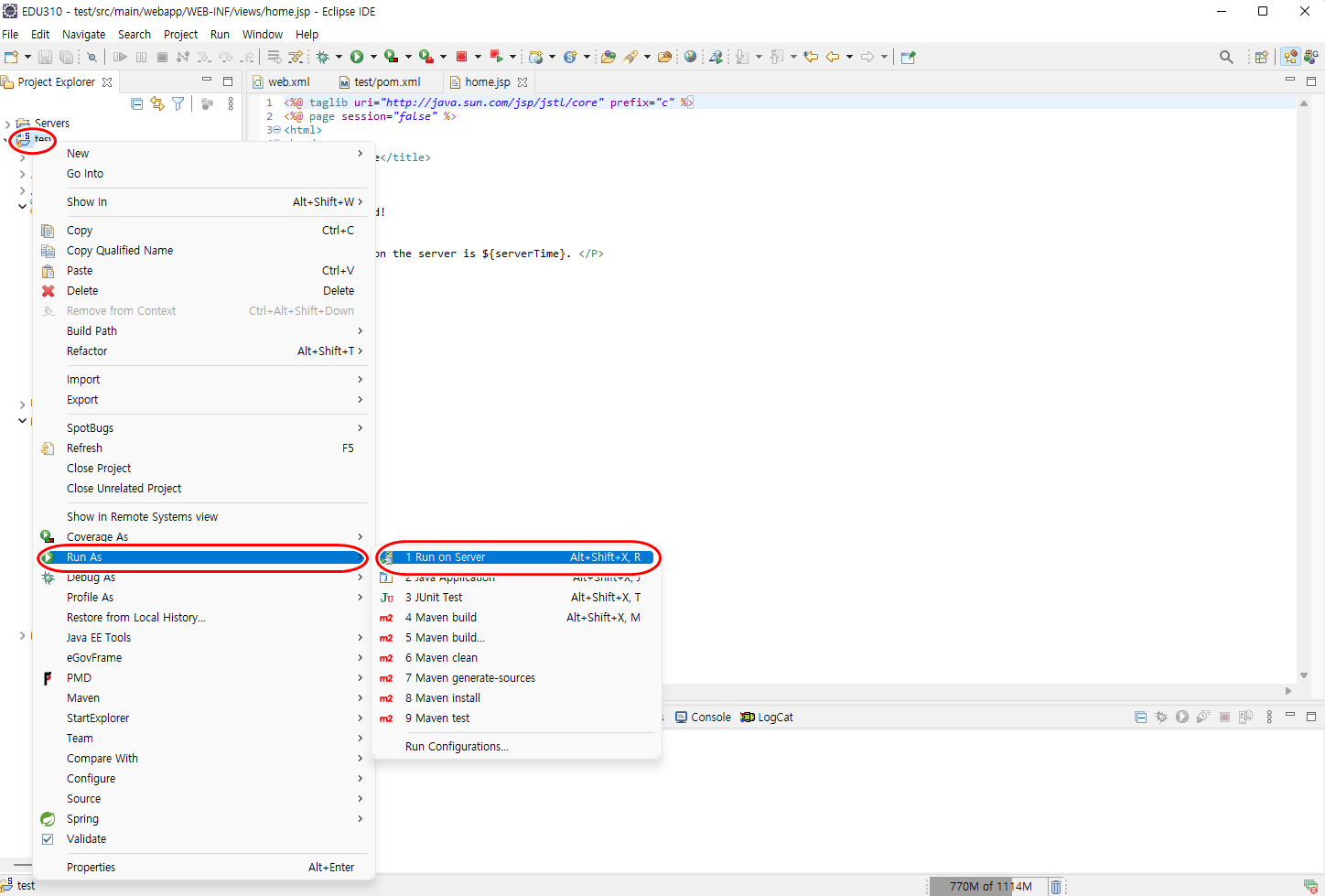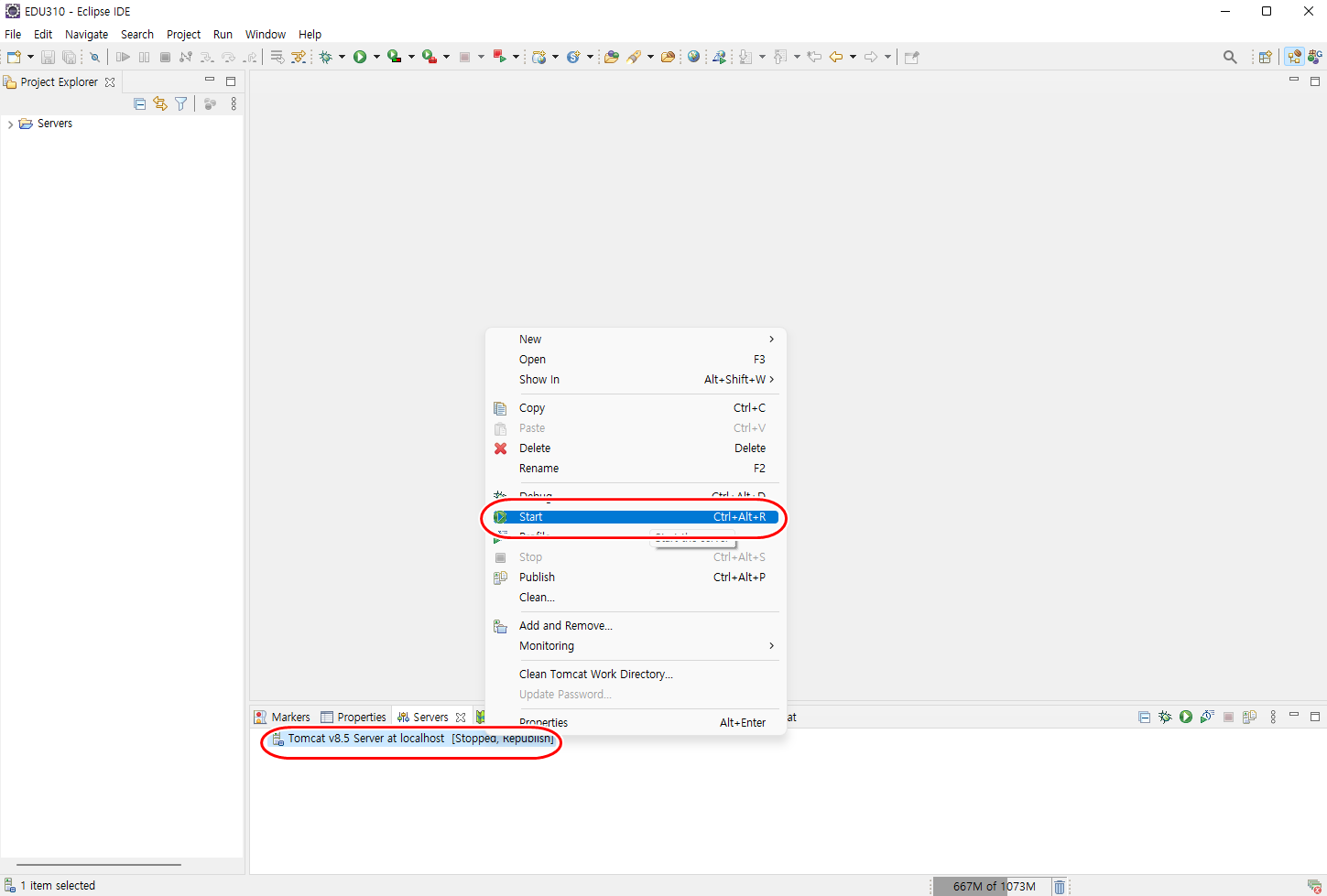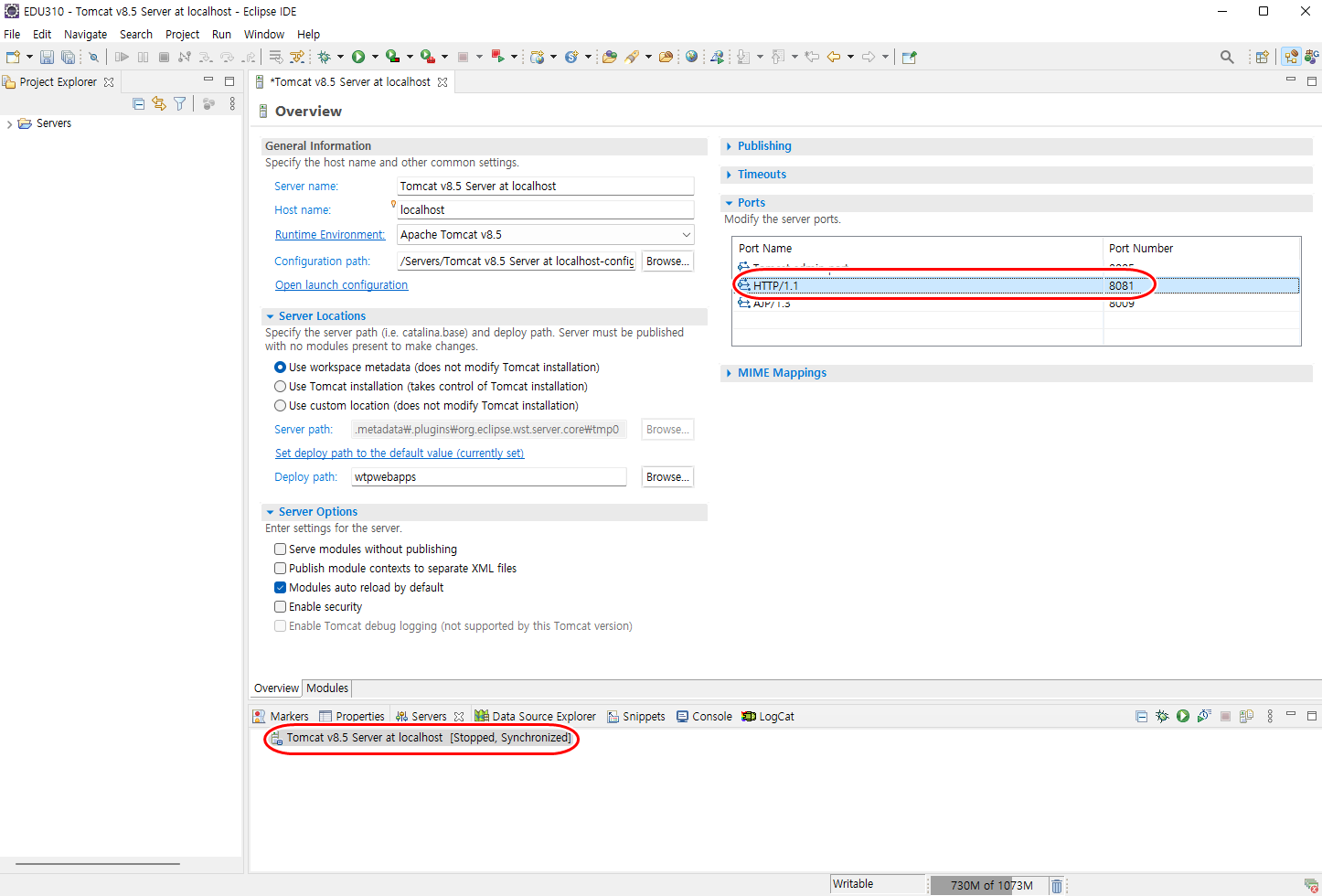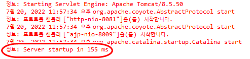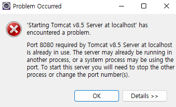 서버 실행시 위 오류가 발생하였을 때 톰캣 포트를 변경하면 해결 된다