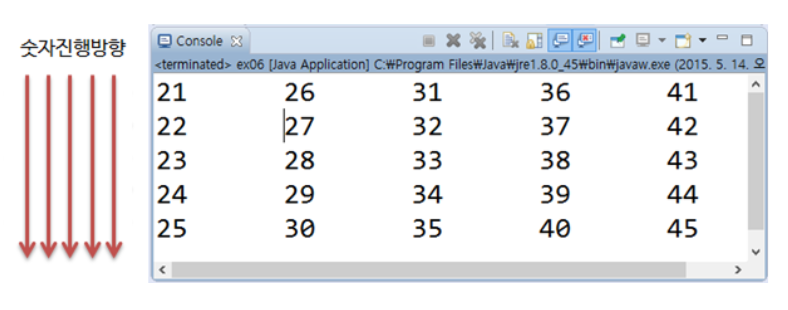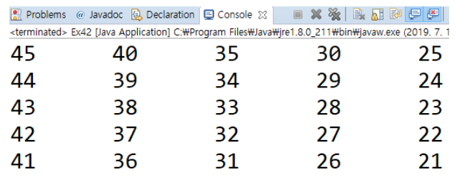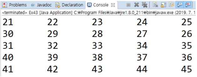 EX_02. 5행 5열 크기의 2차원 배열 array를 선언하고 21 ~ 45까지 초기화 하세요.