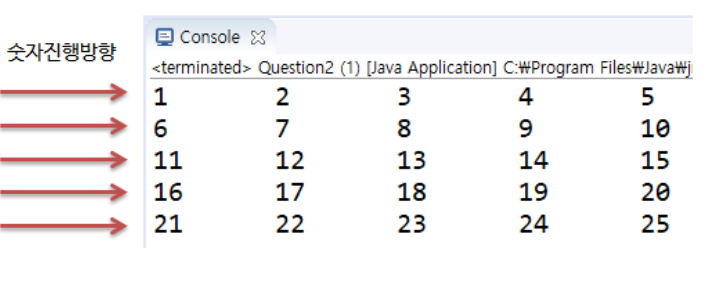 EX_01. 5행 5열 크기의 2차원 배열 array를 선언하고 1~25까지 초기화 하세요